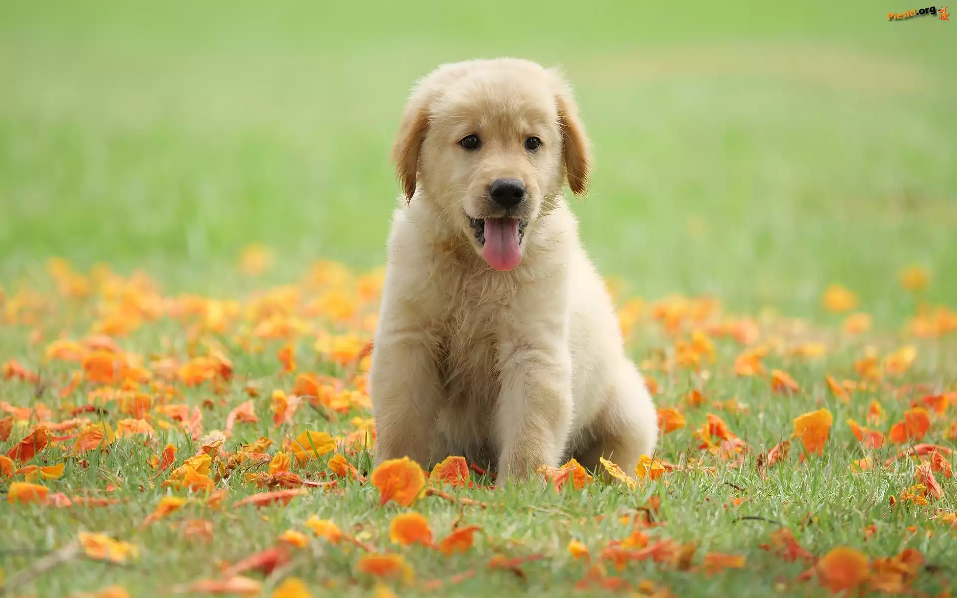Łąka, Golden retriever, Szczeniak, Jęzor, Liście