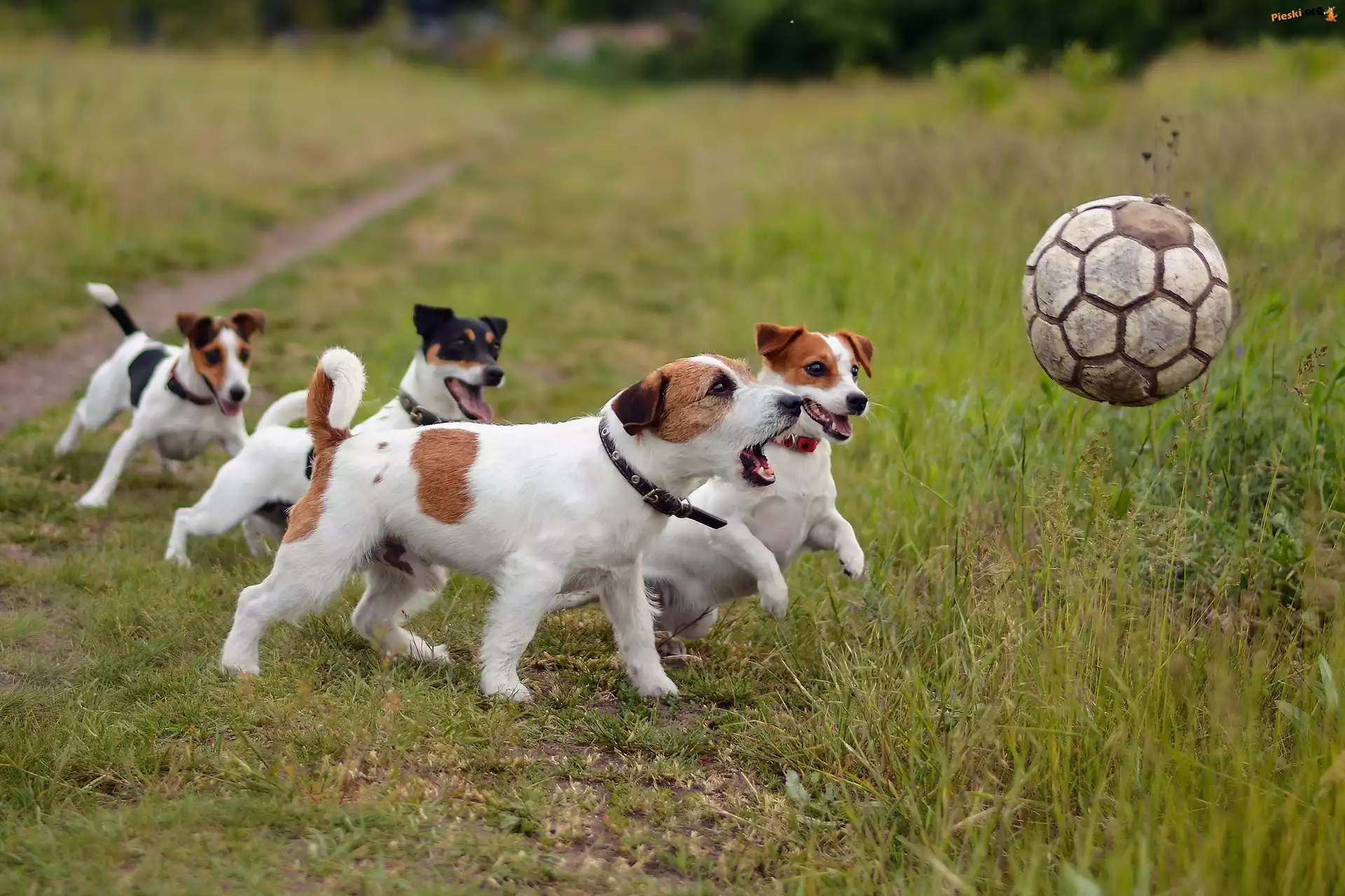 Łąka, Zabawa, Psy, Piłką, Jack Russell Terrier, Pieski