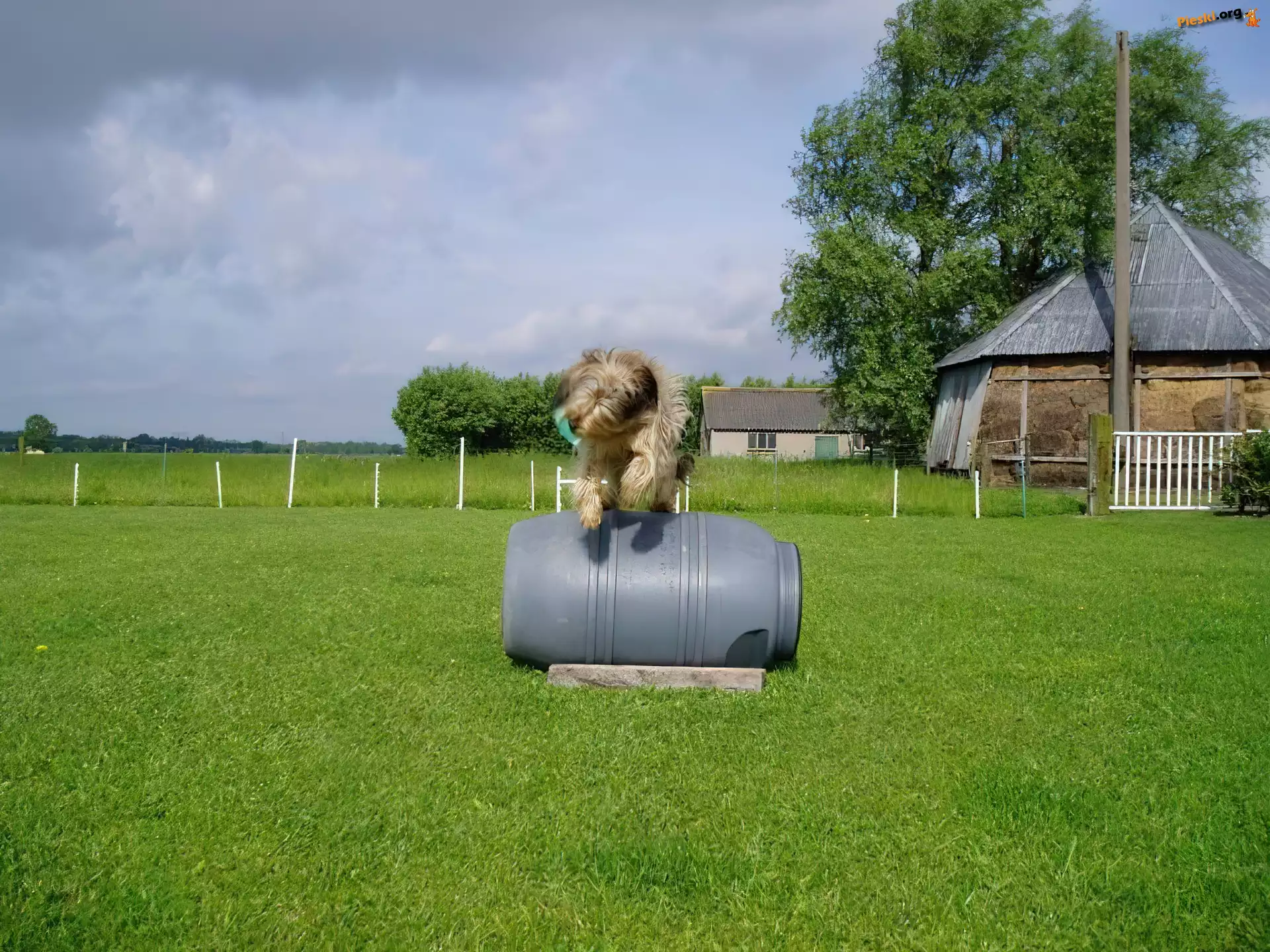 beczka, Owczarek kataloński, trawa, szopa
