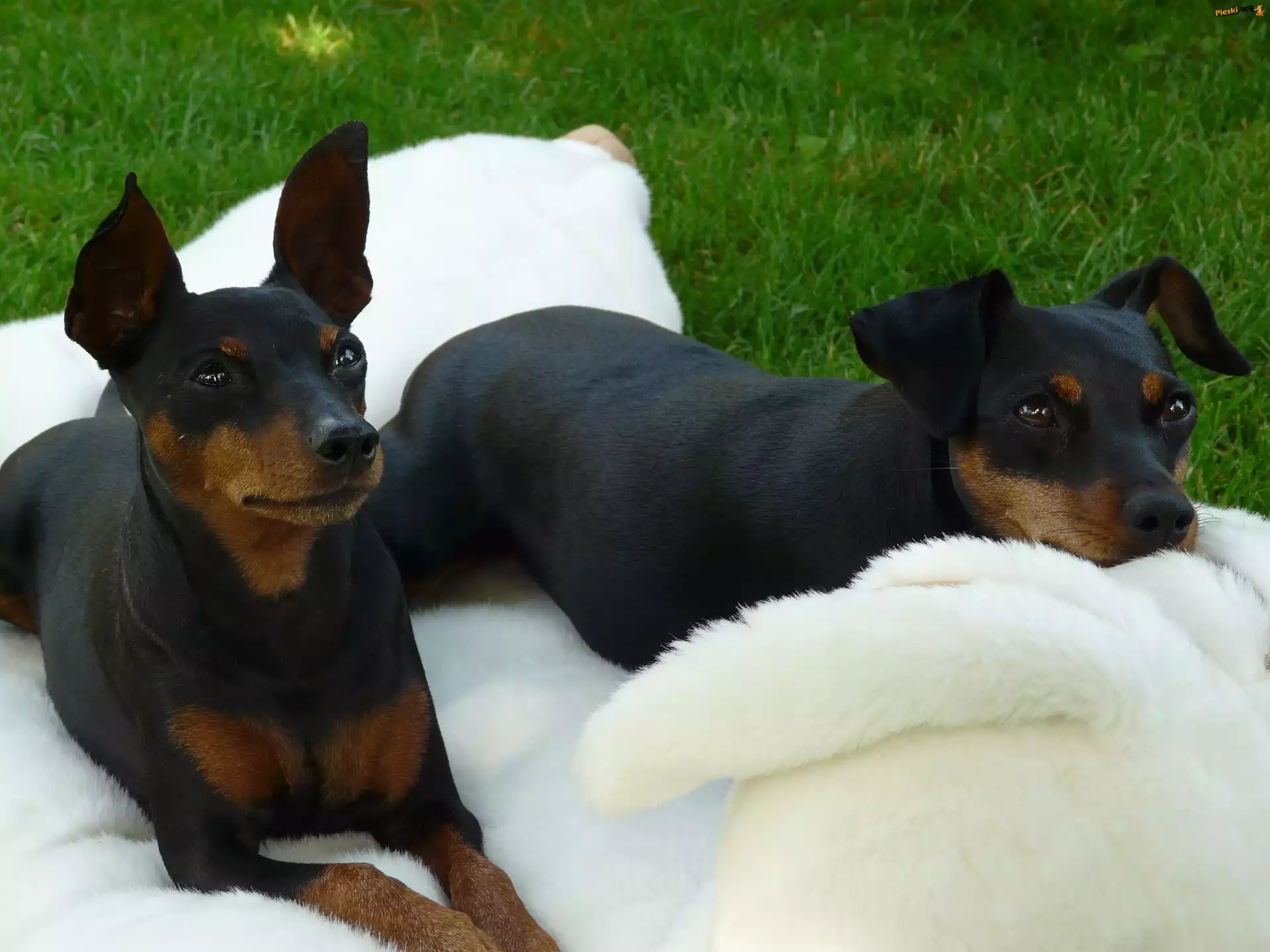 biały, dwa, Pinczery miniaturowe, koc, Pieski