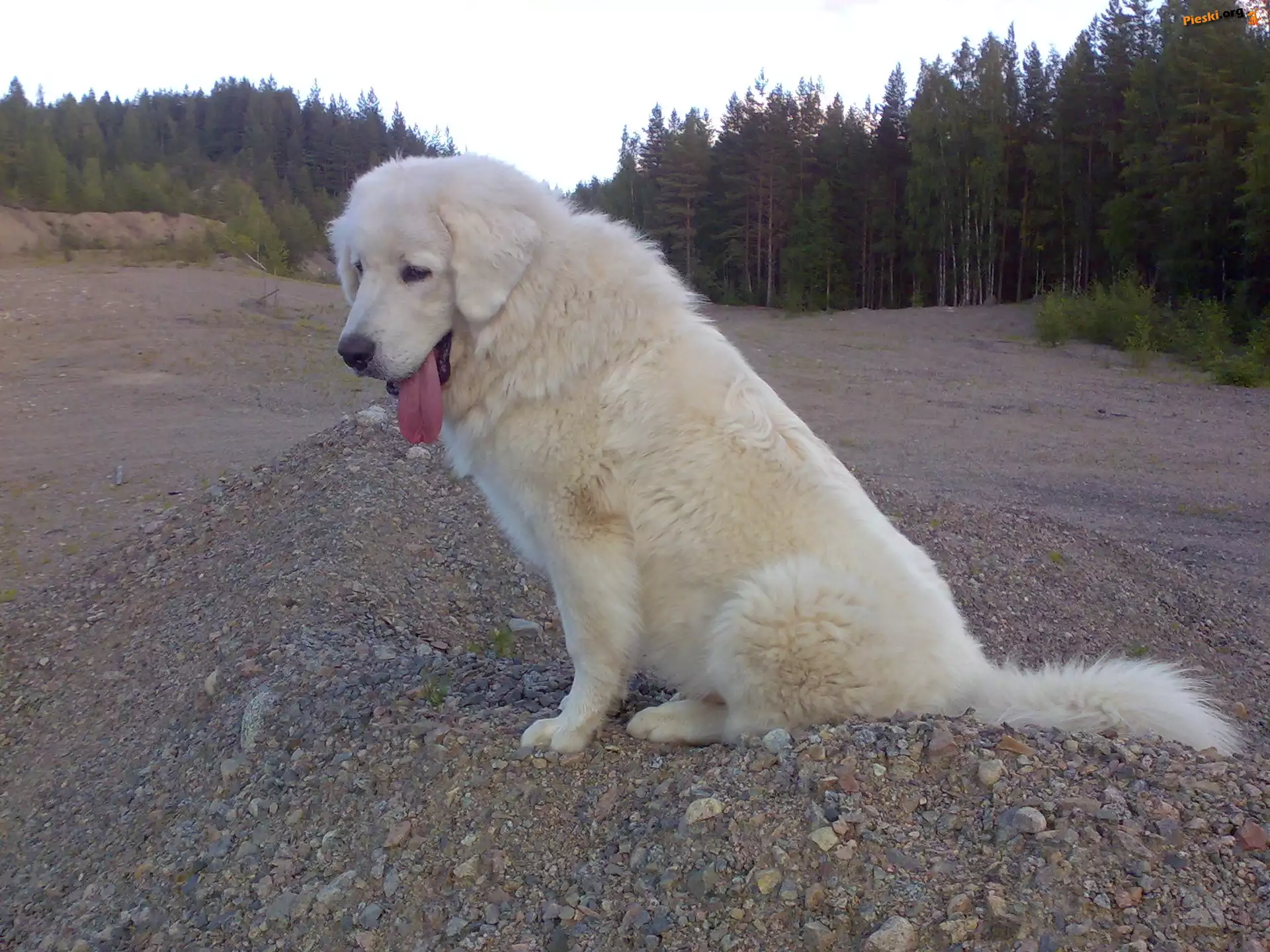 Trawa, Dwa, Pieski, Niebo Owczarek podhalański, zielona, trawa Biały, Polski owczarek podhalański, język Biały, mały, piesek skórzana, Głowa, Owczarka podhalańskiego, obroża Mordka, Polskiego owczarka podhalańskiego Pies, Owczarek Podhalański czerwona, Owczarek podhalański, zęby, obroża