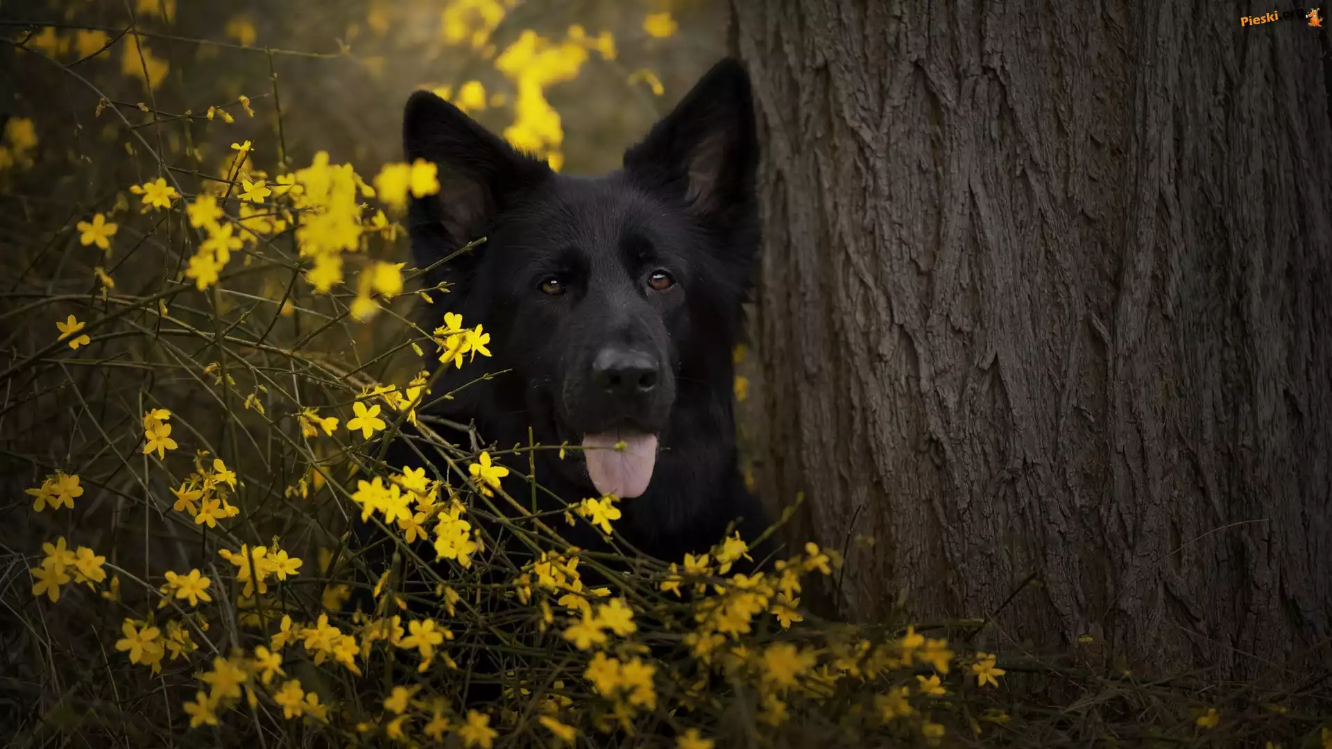 Drzewo, Czarny owczarek niemiecki, Pies, Mordka, Kwiaty, Pieski