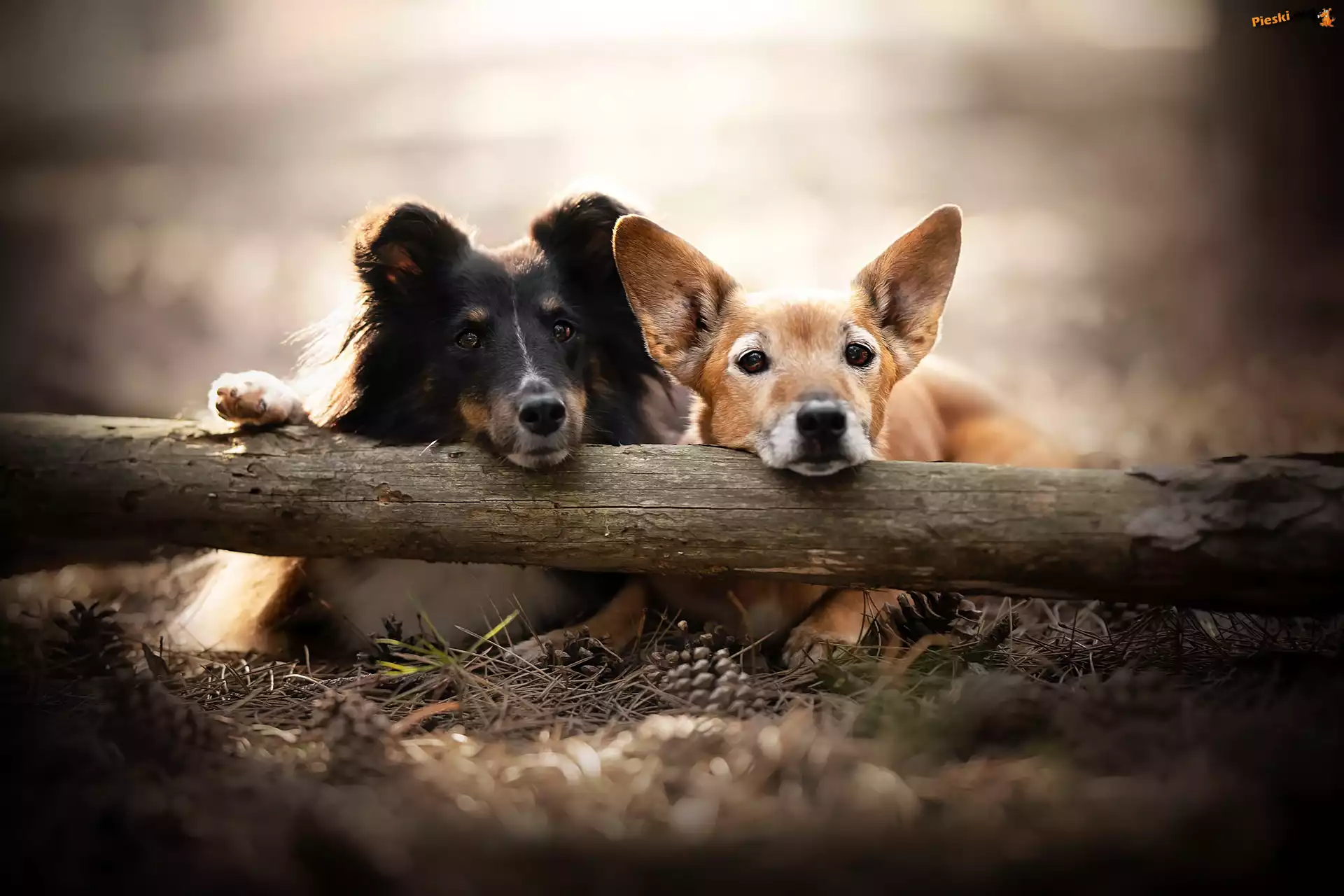Kłoda, Dwa, Drzewa, Owczarek szetlandzki, Psy, Kundelek, Szyszki
