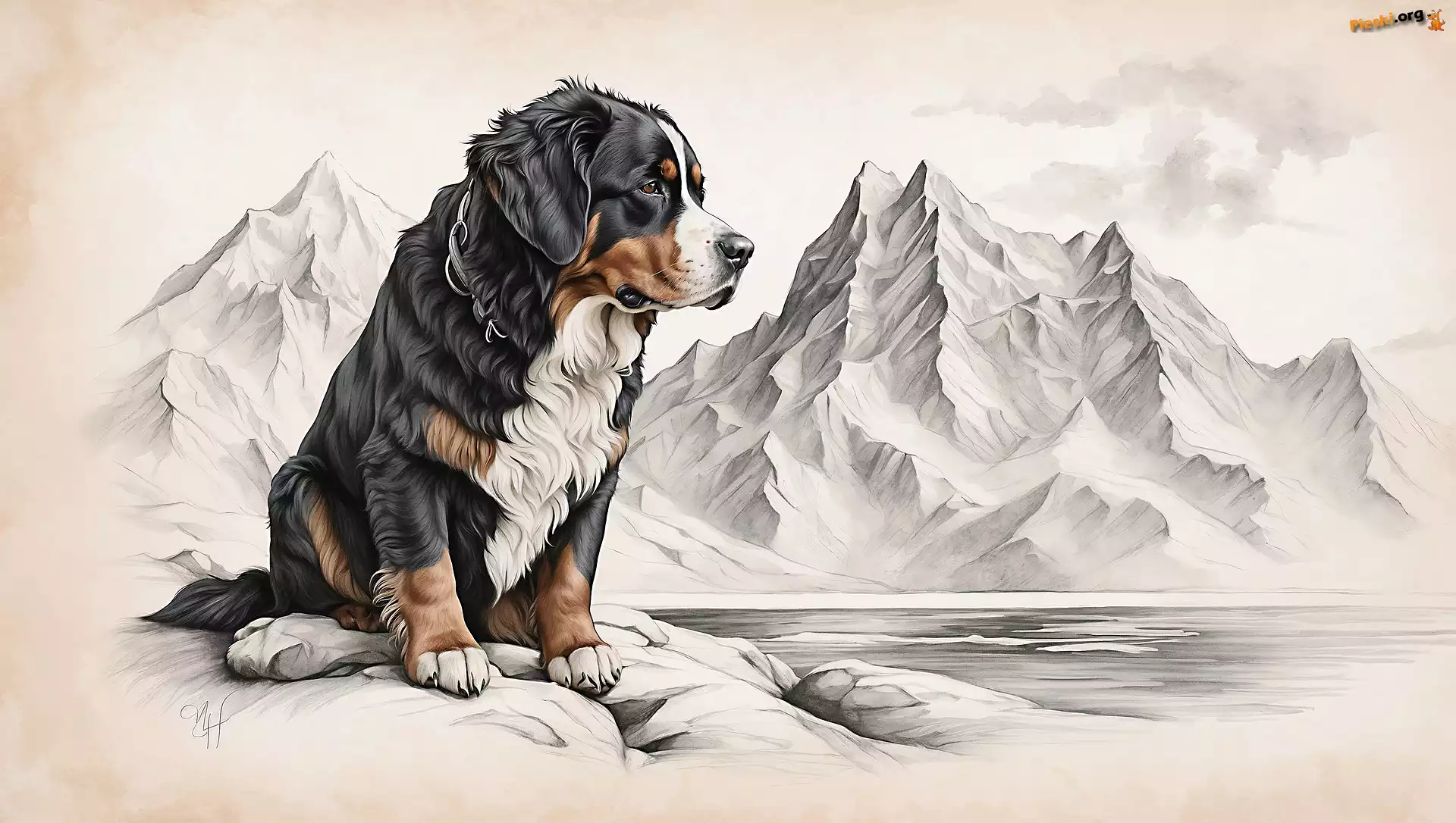 Zima, Rysunek, Pies, Góry, Berneński pies pasterski