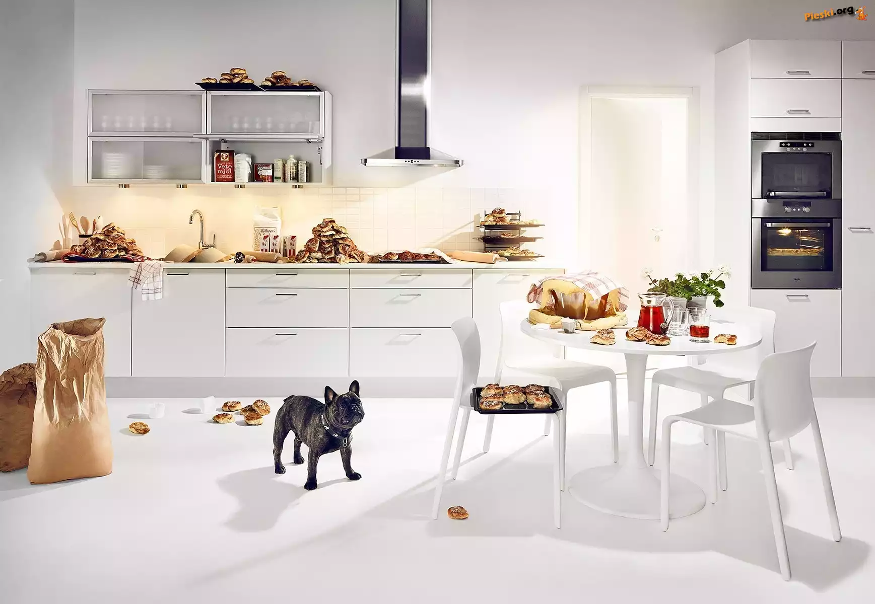 Kuchnia, Stół, Bułeczki, Pies, Słodkie, Krzesła, Pieski