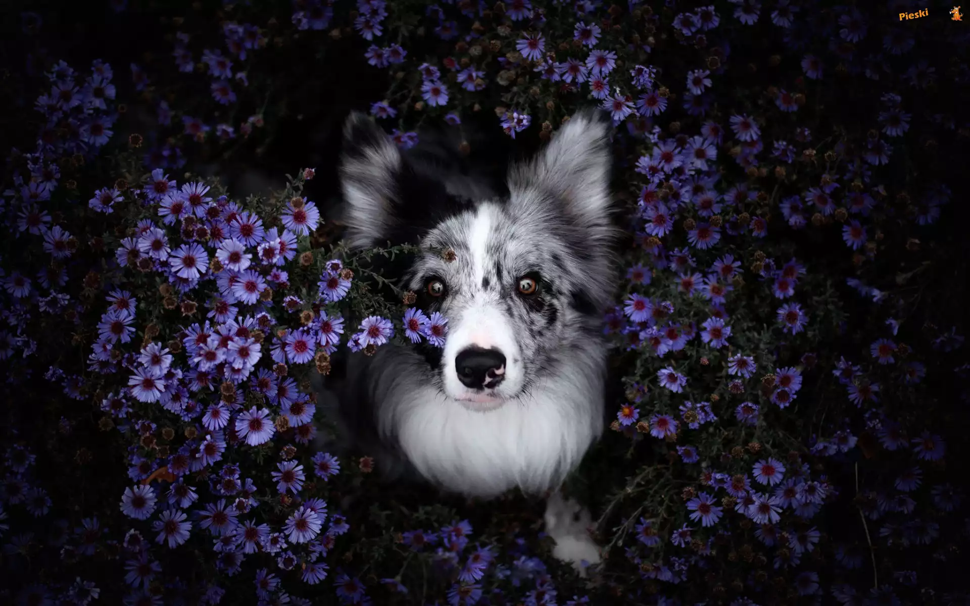 Kwiaty, Pies, Border collie, Astry marcinki, Pieski