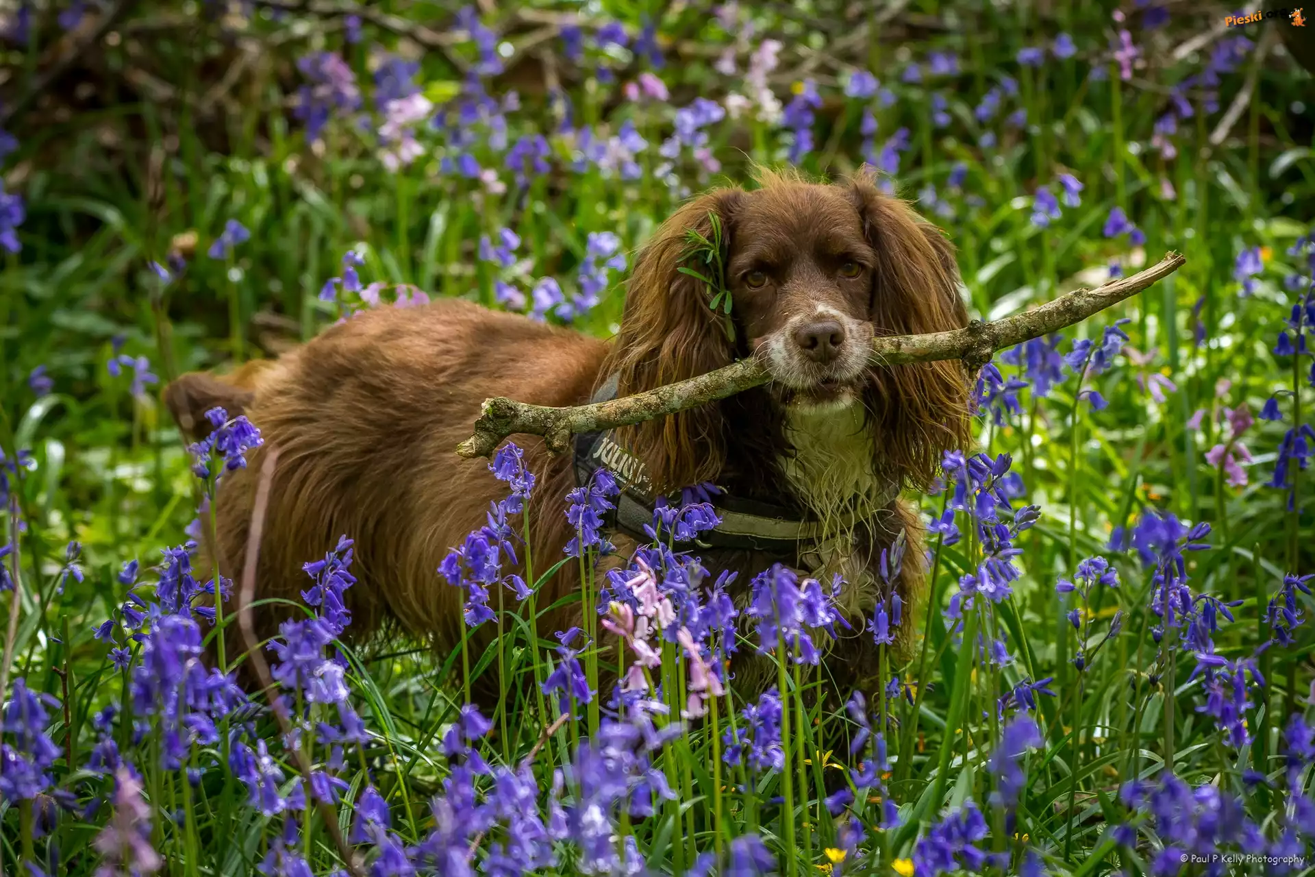 Kwiaty, Spaniel, Patyk, Hiacyntowce, Pieski