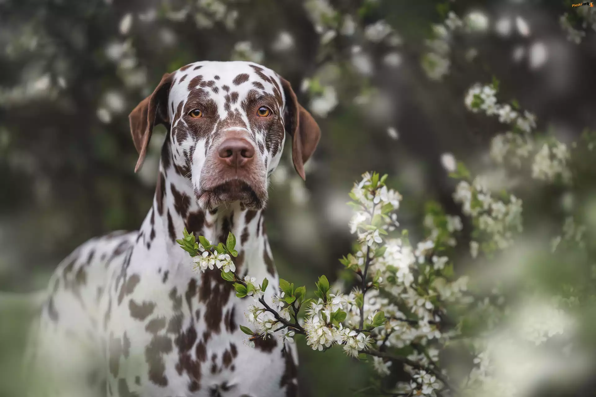 Gałązki, Kwiaty, Pies, Białe, Dalmatyńczyk, Pieski