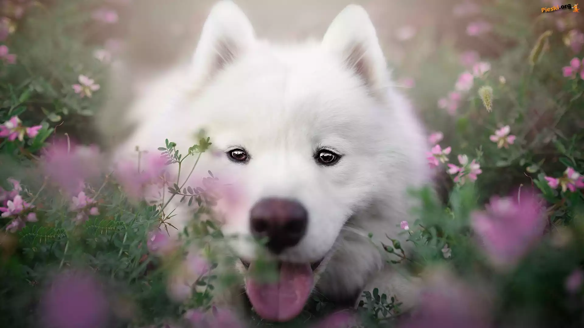 Kwiaty, Pies, Biały, Samojed, Zbliżenie