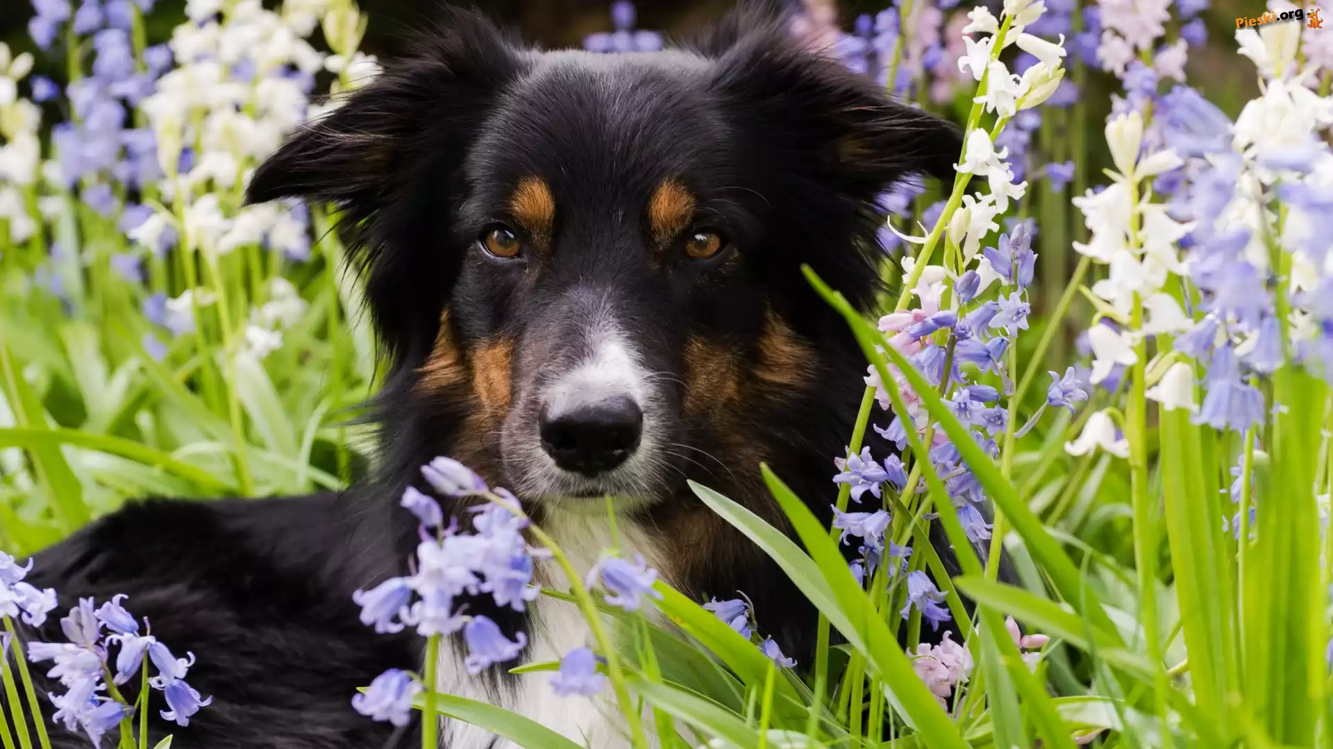 Kwiaty, Border collie, Pies, Trawa, Mordka, Pieski