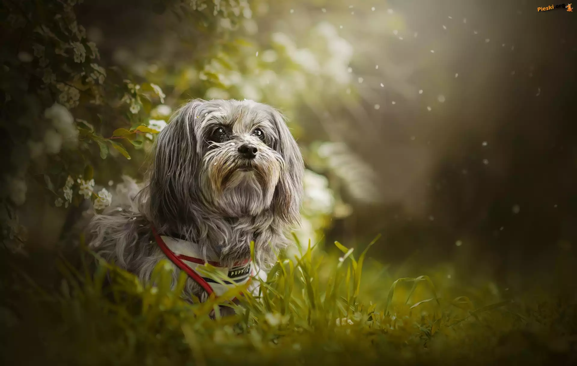 Pies, Trawa Róże, Szary, Piesek Lwi piesek, Trawa, Rośliny Głowa, Lwi piesek, Lowchen, Trawa dwa, białe, Lwi pieski Trawa, Lwi Piesek, Dwa, Szczeniaki