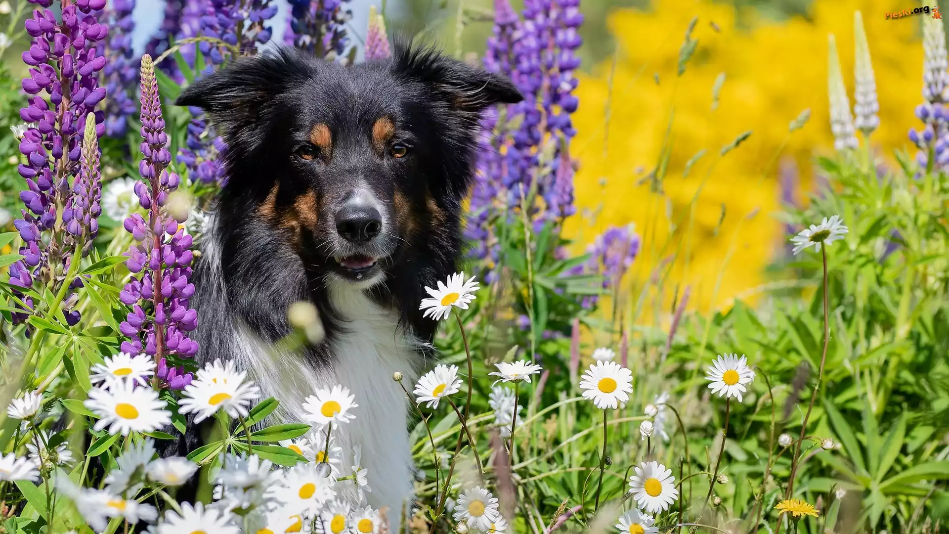 Pies, Margerytki, Łubin, Border collie, Kwiaty, Trawa, Pieski