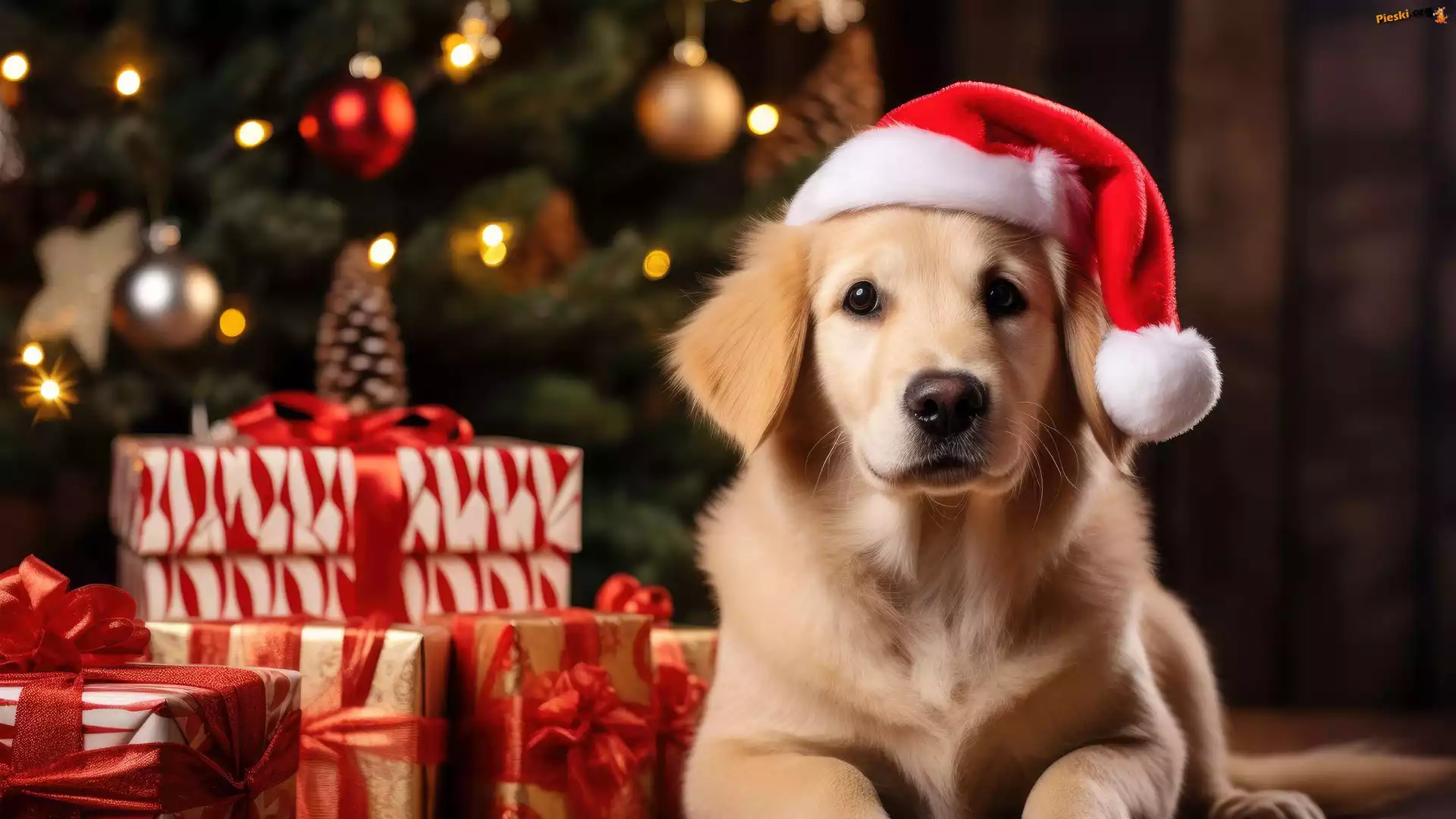 Prezenty, Mikołaj, Golden retriever, Pies, Pieski