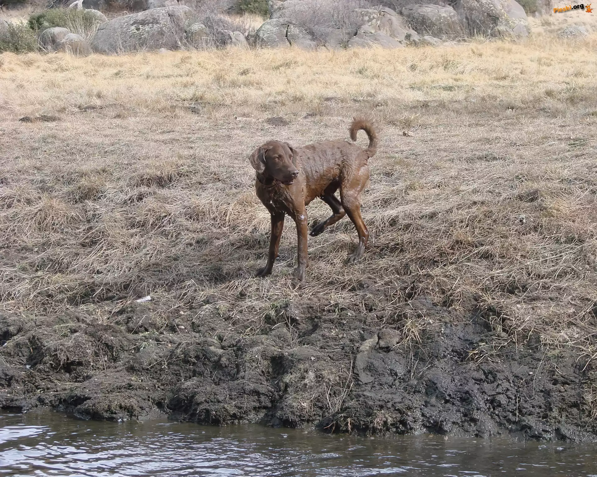 Chesapeake Bay retriever, flaga USA Chesapeake Bay retriever, niebieska, woda Dwa, Chesapeake Bay retrievery, kaczki Piękny, duży, Chesapeake Bay retriever Chesapeake Bay retrievery, mokre, Dwa Pysk, Chesapeake Bay retrievera Brązowy, Chesapeake Bay retriever Mokry, Chesapeake Bay retriever