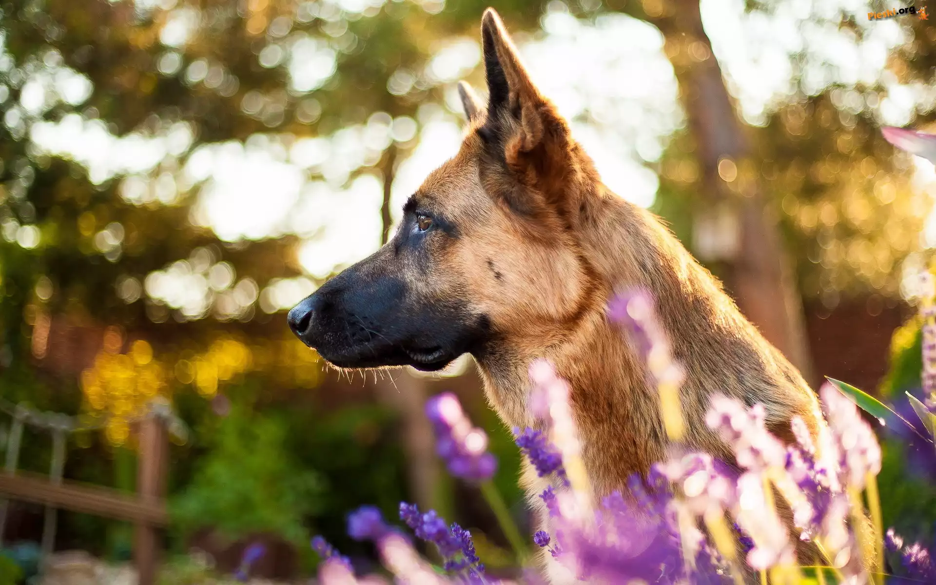 Rozmyte, Owczarek belgijski Malinois, Pies, Mordka, Tło Owczarek belgijski Malinois, Pies, Mordka, Kwiaty Wrzosy, Pies, Rozmyte, Mordka, Owczarek belgijski malinois, Jęzor, Tło