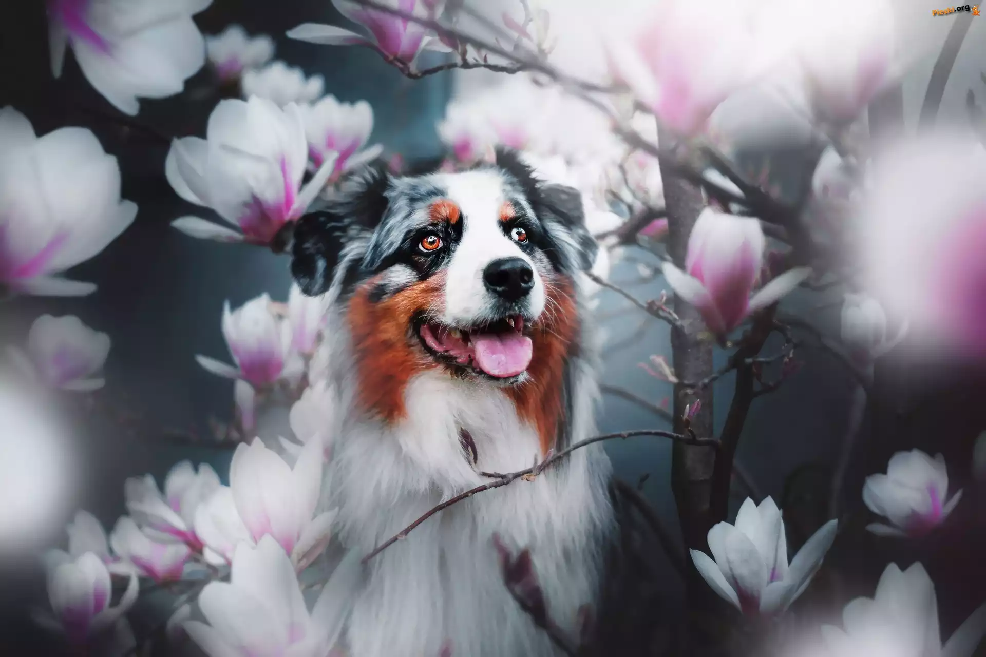 Pies, Owczarek australijski, Magnolie, Pieski