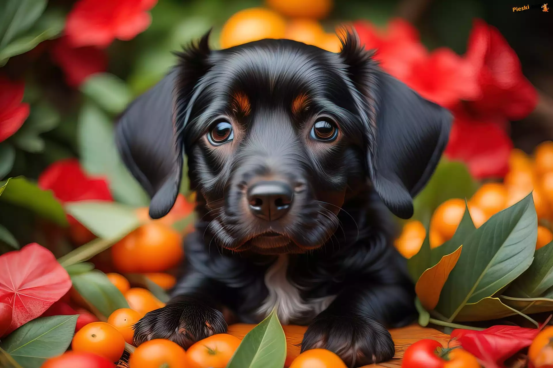 Listki, Kwiaty, Czarny, Pies, Pieski