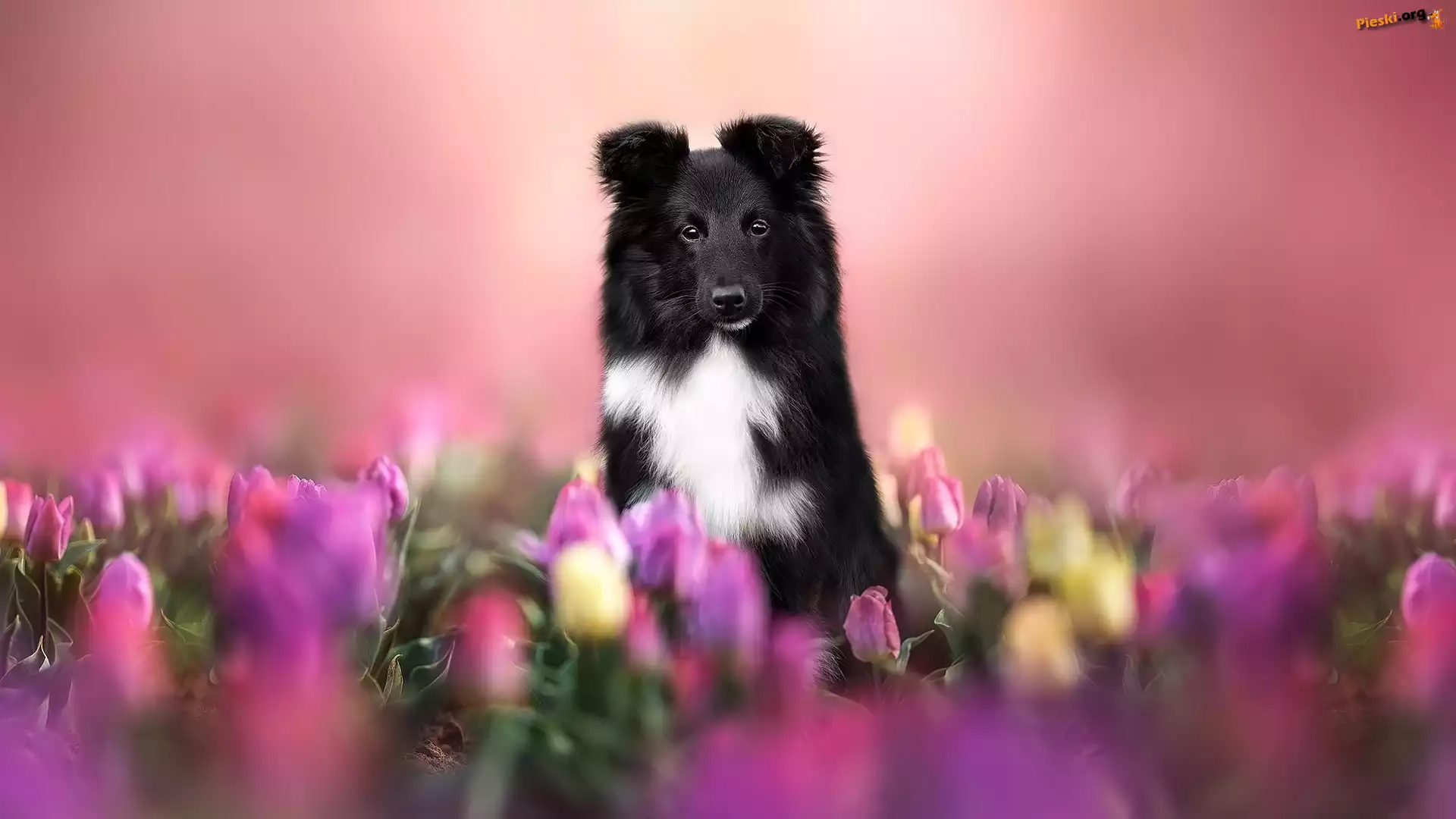 Tulipany, Owczarek szetlandzki, Pies, Pieski