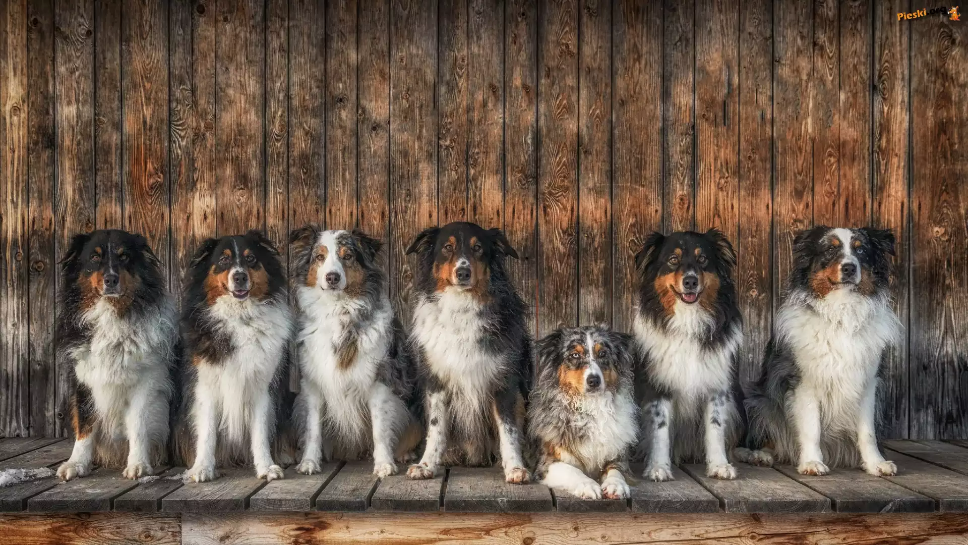 Podest, Psy, Ściana, Owczarki Australijskie, Siedem, Drewniany, Deski, Pieski