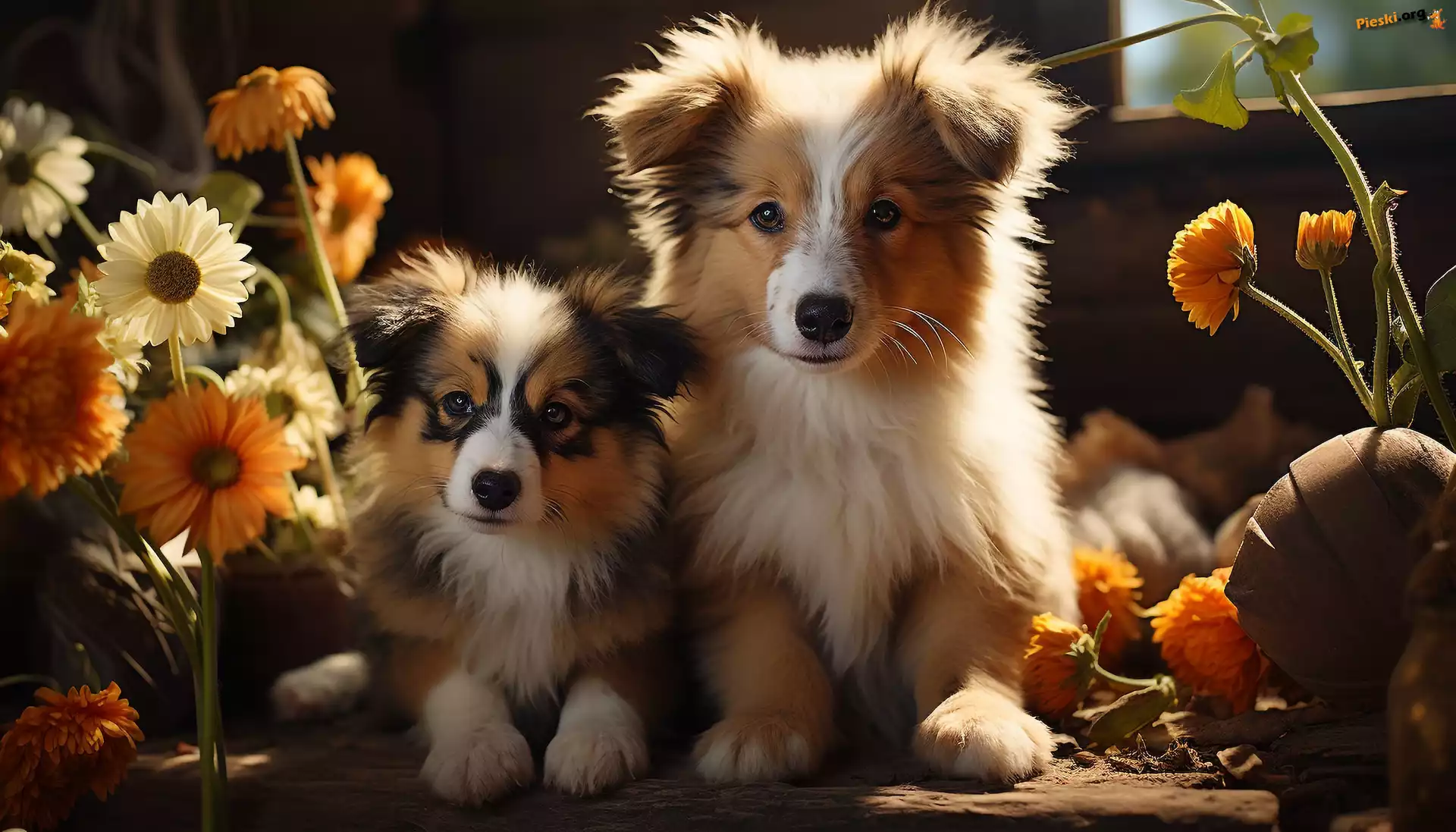 Kwiaty, Szczeniaki, Dwa, Psy, Pieski