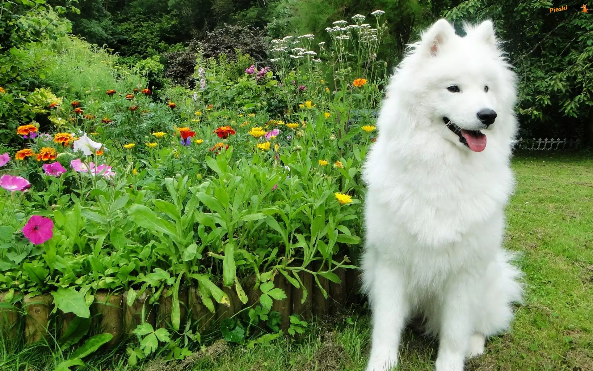 Samojed, Ogród Szczeniak, Piesek, Biały, Liście zima, Samojedy, dwa Kwiaty, Pies, Biały, Samojed, Zbliżenie Samojed, widok Biały, Mordka, Język, Pies, Samojed, Zabawka Samojed, Biały, Pies, Wodospad Szczeniak, Samojed Samojed, choinka Samojed, Ogród Pies, Samojed, Łąka młody, Samojed głowa, Samojeda słodki, szczeniak, Samojed