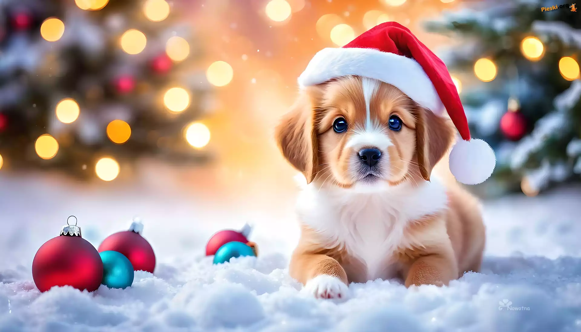 Grafika, Czapka, Mikołaja, Szczeniak, Śnieg, Bombki