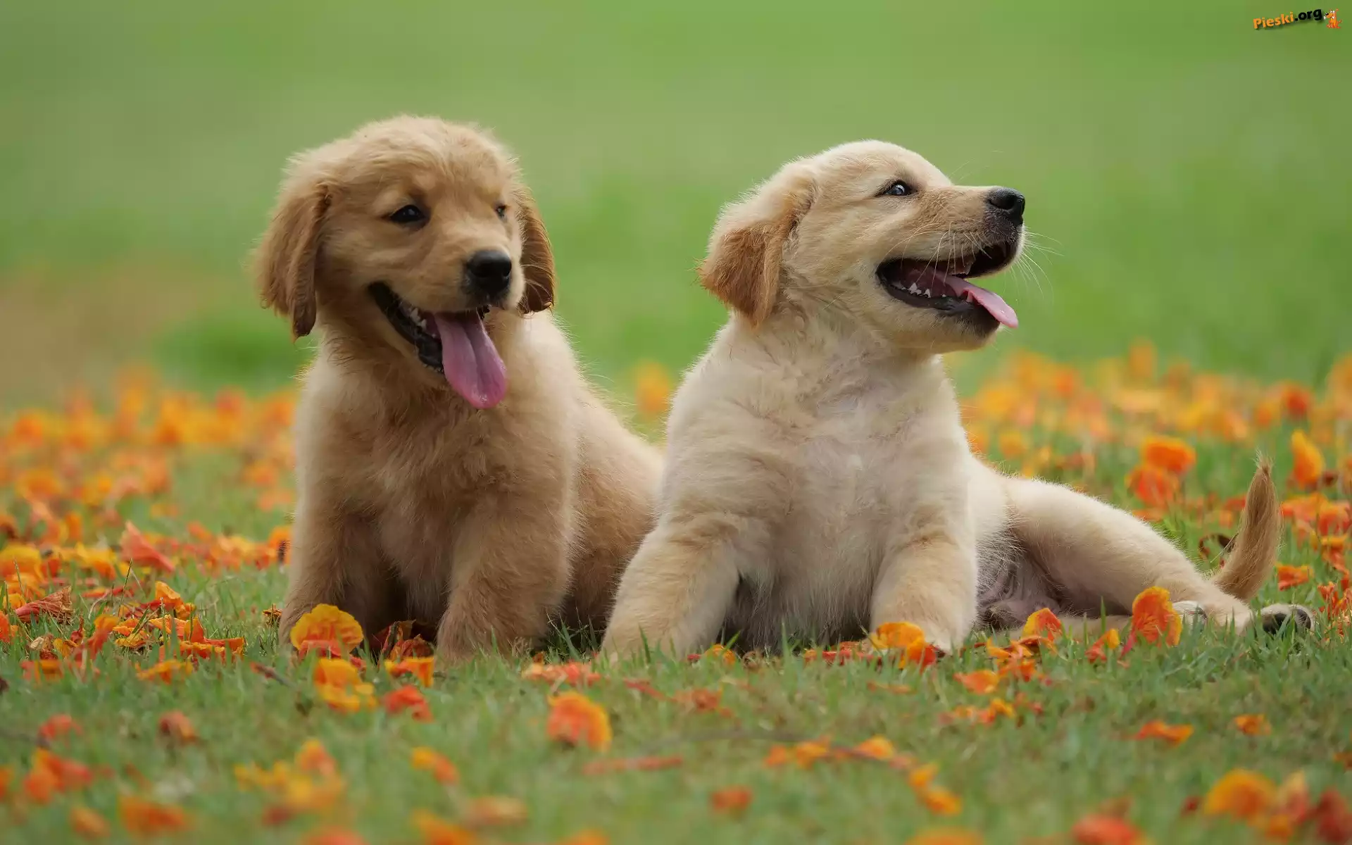 Zielona, Szczeniaki, Dwa, Golden retriever, Trawa, Pieski
