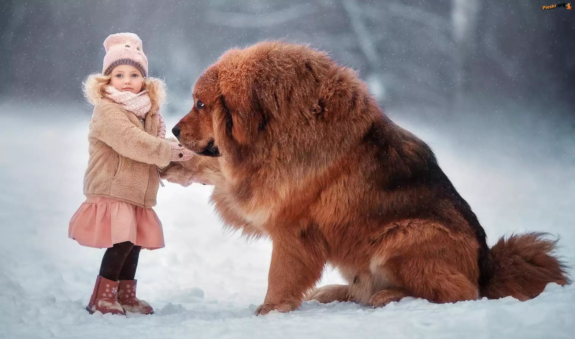 Zima, Pies, Dziewczynka, Mastif tybetański, Śnieg, Pieski
